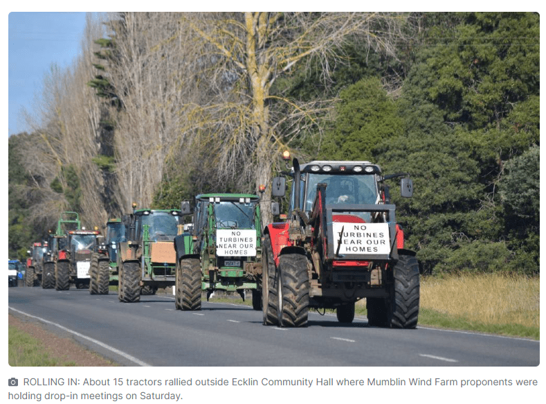 A migration of 15 machines with signs including “No Wind Farms Here” and “No Turbines Near our Homes” journeyed to Ecklin Community Hall where Mumblin Wind Farm proponents were holding drop-in meetings.